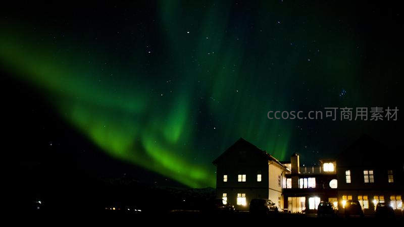 绿色极光如轻纱般掠过屋顶,与屋内透出的温暖灯光形成鲜明对比,在静谧冬夜里营造出既梦幻又温馨的人居自然和谐景象。