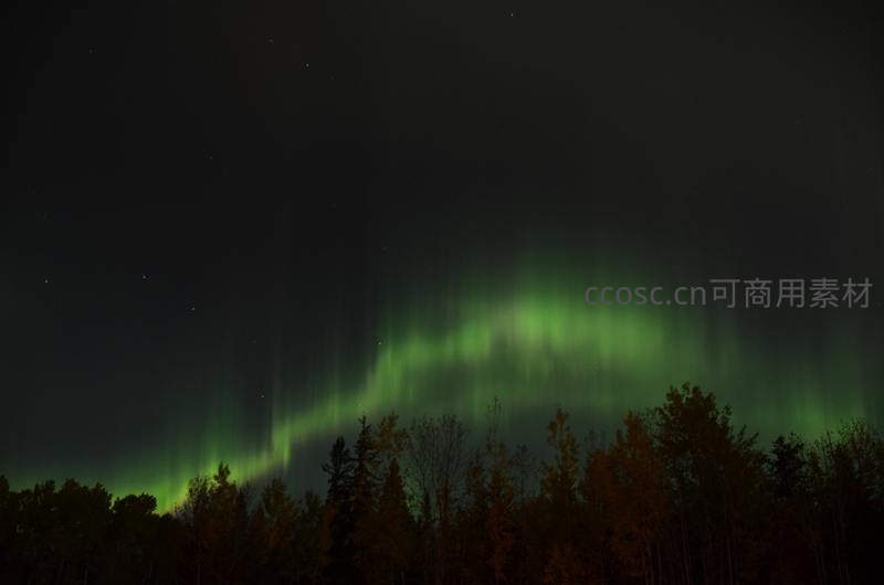 在深邃的夜空中,绚烂的绿色极光如丝带般飘舞,下方是沉默的森林剪影,构成一幅壮丽而宁静的自然画卷。