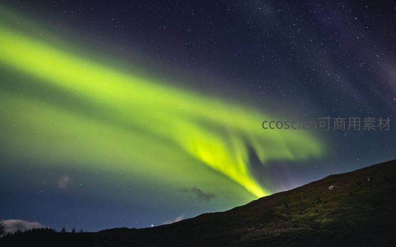 一道明亮的绿色极光横贯夜空,掠过山脊线,与点点繁星共同构成一幅宁静而壮美的自然画卷。