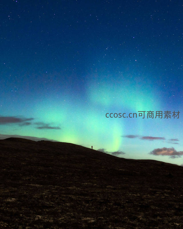 在深邃的夜空下,绿色极光如薄纱般飘舞于山丘之上,渺小的人影成为这壮丽天象前的静默见证者。