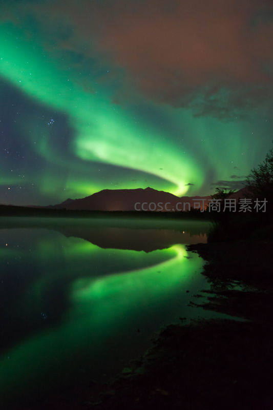 绚丽的绿色极光在夜空中舞动,其光芒完美倒映在平静的湖面上,远处山峦剪影与星河相映,构成一幅梦幻般的自然画卷。