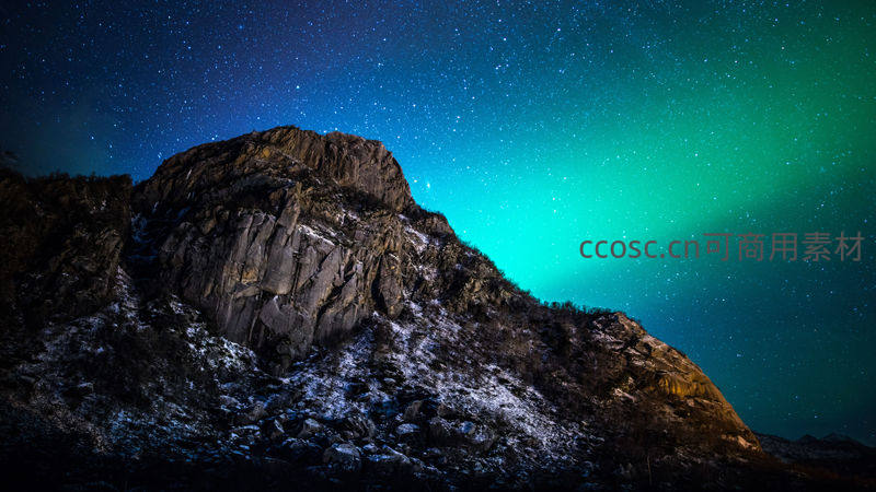 璀璨星河之下,绿色极光轻抚积雪山峦,岩石轮廓分明,尽显大自然的雄浑与静谧。