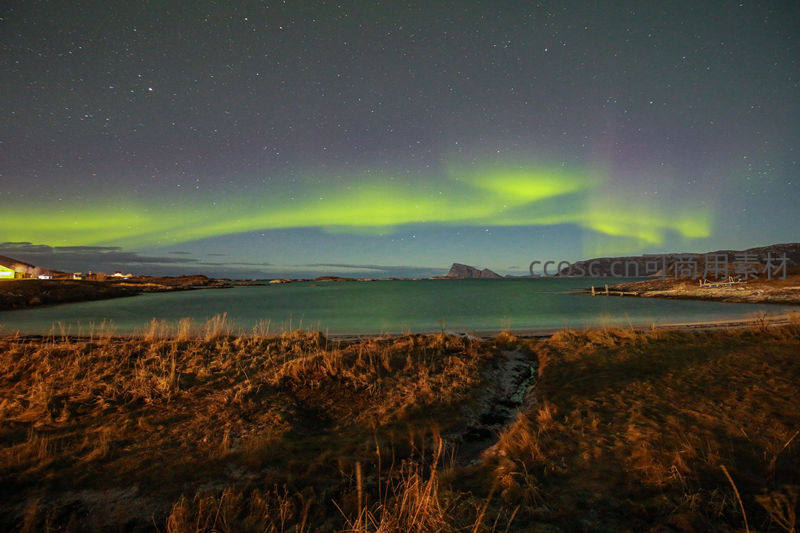 宁静海湾之上,绿色极光与点点繁星交相辉映,水天一色,倒影朦胧,宛如仙境。