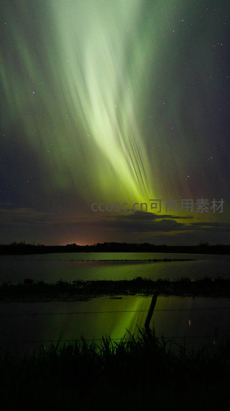 绿色极光如丝帘般从天际垂落,其光芒在平静湖面投下清晰倒影,营造出宁静梦幻的意境。