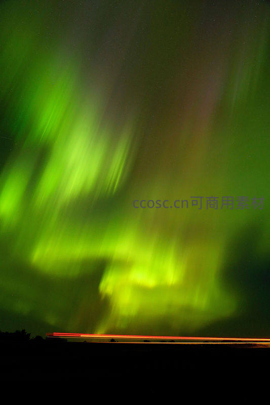 绿色极光如丝带般在深邃夜空中流动,地平线上车辆的红色光轨为这幅静谧画卷增添了动感与生命。