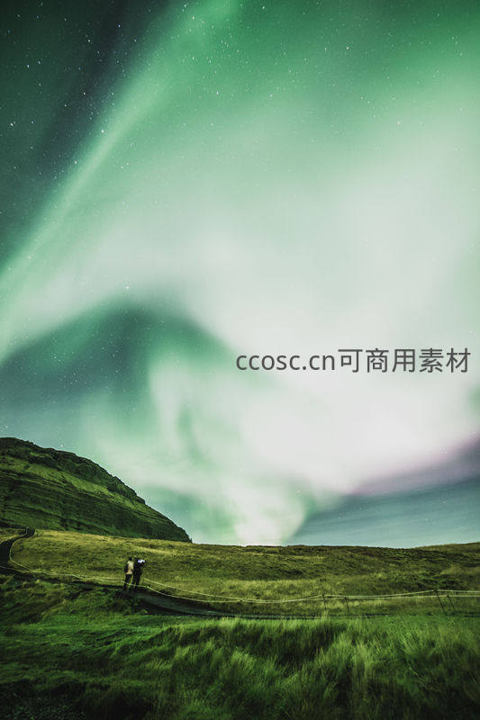 一人伫立草坡仰望天际,流动的极光如绿色瀑布倾泻,营造梦幻般的探索氛围。