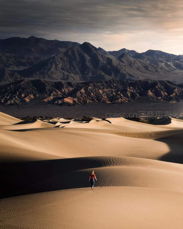 一人独行在广袤的金色沙丘之上,背景是连绵起伏的深色山脉与暮色天空,画面充满宁静与壮阔之感。