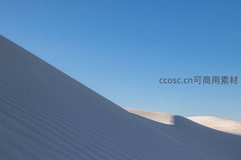洁白细腻的沙丘在晴朗湛蓝天空下铺展,沙面波纹如水,营造出宁静而辽阔的视觉体验。