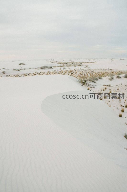 洁白的沙丘与稀疏的枯黄灌木形成鲜明对比,在灰白天空下呈现一种荒凉却诗意的自然景观。