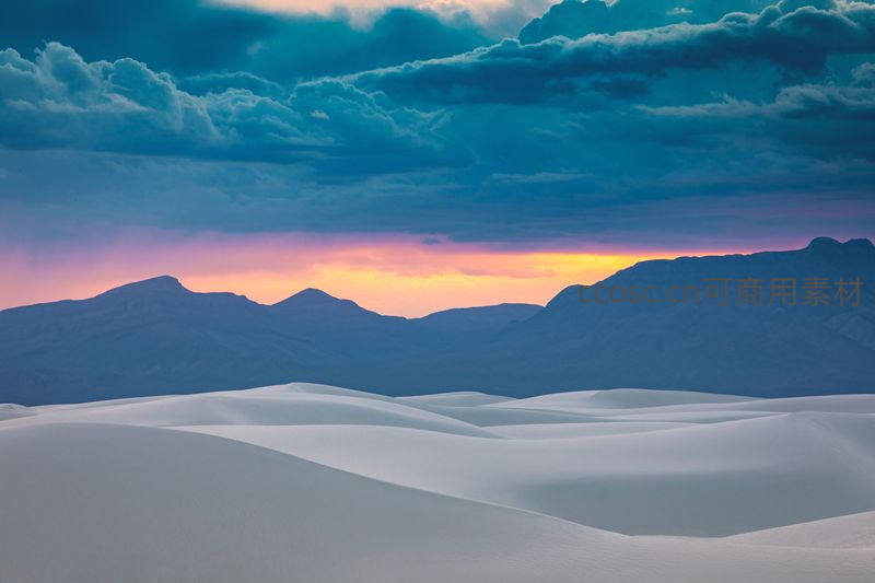 绚烂的晚霞穿透厚重云层,为远处山脉与近处白色沙丘披上梦幻色彩,营造出史诗般的宁静氛围。