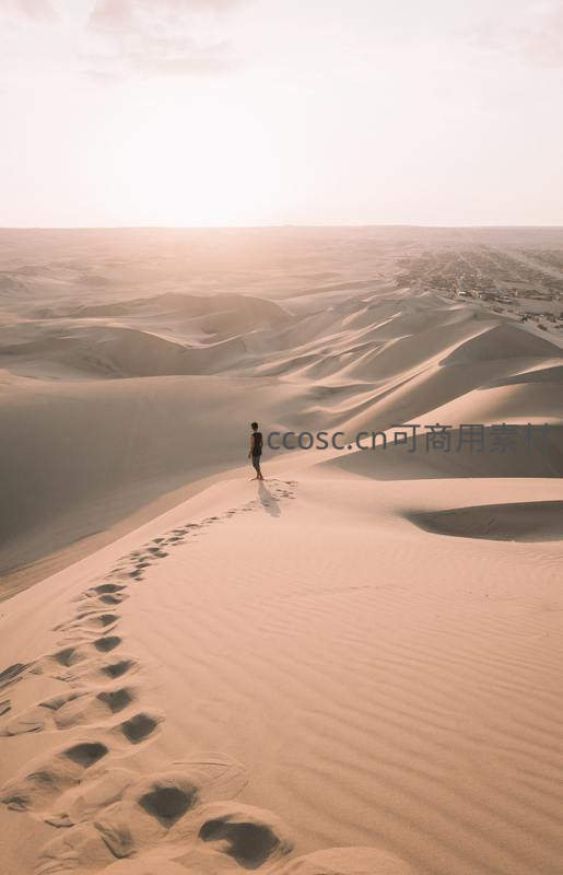 一位孤独的旅人站在高耸的沙丘上,身后留下一串清晰的脚印,眺望着远方的城市,象征着探索与前行的勇气。