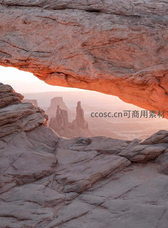 透过巨大的天然石拱门,可以看到远处峡谷在夕阳余晖中被染成暖橙色,岩石的纹理与光影交织,美不胜收。