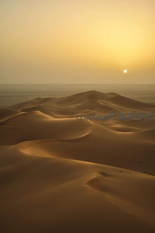 夕阳将沙丘染成一片温暖的金黄,柔和的光线勾勒出起伏的曲线,仿佛大地披上了流动的丝绸外衣。