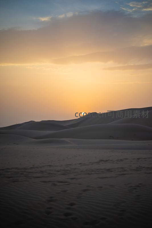 一轮金红的太阳缓缓沉入沙丘之巅,将天空染成温暖的橙黄,大地在暮色中归于一片宁静祥和。