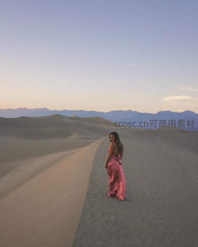 一位身着粉色长裙的女子独自站在广袤的沙丘上,背对镜头回眸,远处连绵山脉与渐变天空构成壮丽背景。