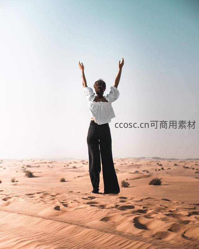 一位女子背对镜头,双臂高高举起,仿佛在拥抱整个沙漠,表达对自由、广阔天地的向往与内心情感的释放。