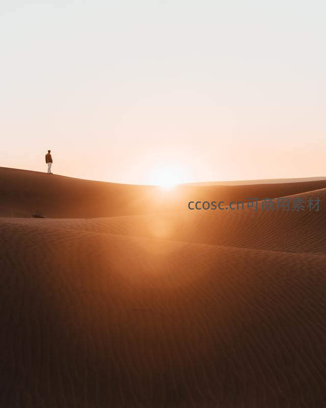 在辉煌的落日余晖中,一个孤独的身影站在沙丘之巅,温暖的金色光芒洒满整个沙海,营造出史诗般的宁静与壮美。