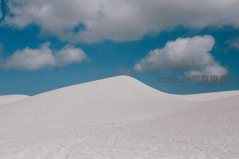 一片洁白如雪的沙丘在晴朗的蓝天下延展,蓬松的云朵点缀其间,呈现出一种超现实的纯净美感,宛如童话世界。