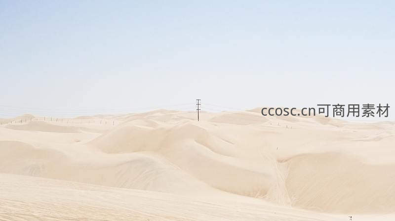 无垠的沙丘在淡蓝色天空下延伸,一根孤零零的电线杆矗立其间,勾勒出人迹罕至的荒凉与静谧。