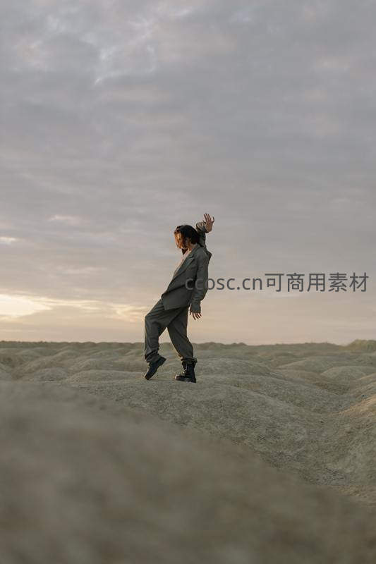 一位身着灰色西装的男子在怪石嶙峋的荒漠中腾空跃起,背景是厚重的云层,将都市感与荒野之美巧妙融合。