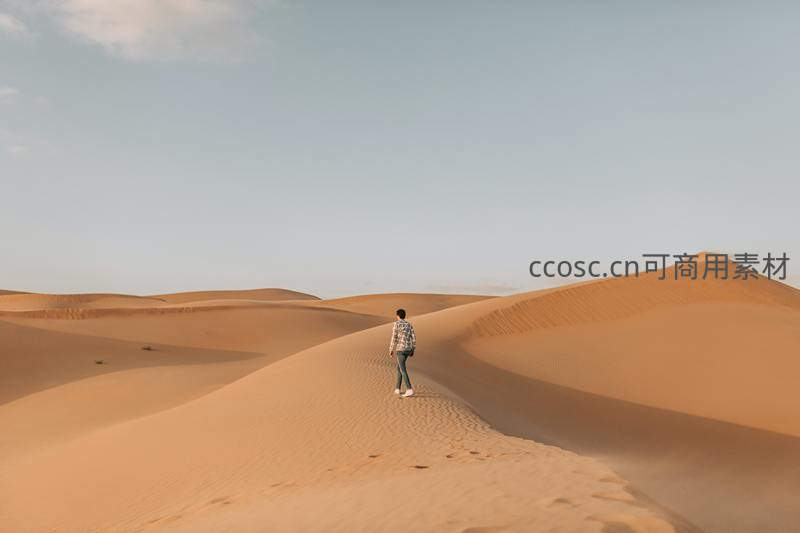 一个身影独自站在高耸的沙丘顶上,俯瞰连绵起伏的沙海,脚下的足迹是其探索的印记,传递着自由与沉思的意境。