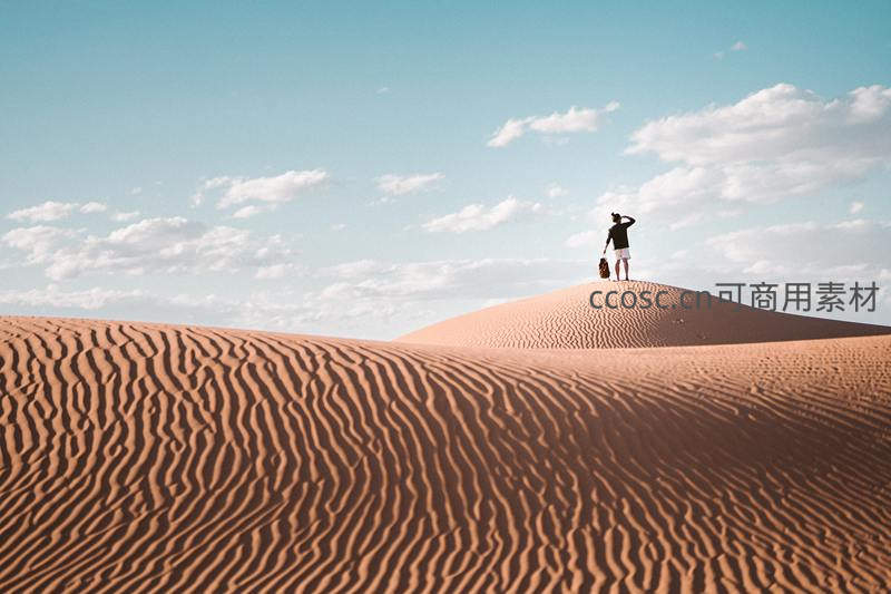 一人站在沙丘最高点,手搭凉棚眺望远方,脚下是如波浪般起伏的沙丘纹理,头顶是辽阔的蓝天白云,尽显征服与开阔之感。