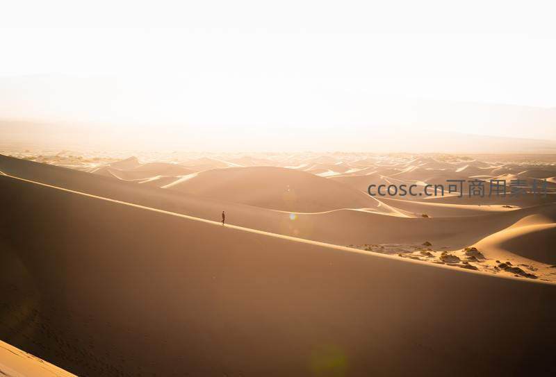 一人独行于无垠沙丘之上,夕阳余晖洒满金色沙漠,渺小身影与壮阔天地形成强烈对比,尽显苍凉与自由。