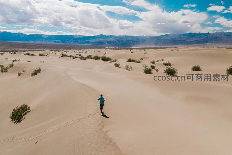 一人穿行于点缀着稀疏灌木的广袤沙海,远方是连绵山脉与多云蓝天,记录着人类在荒芜之地勇敢探索的足迹。