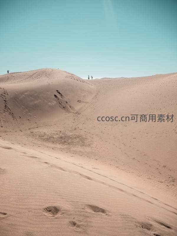 金色沙丘连绵起伏,远处旅人身影渺小,脚印蜿蜒延伸,诉说着征服与探索的勇气。