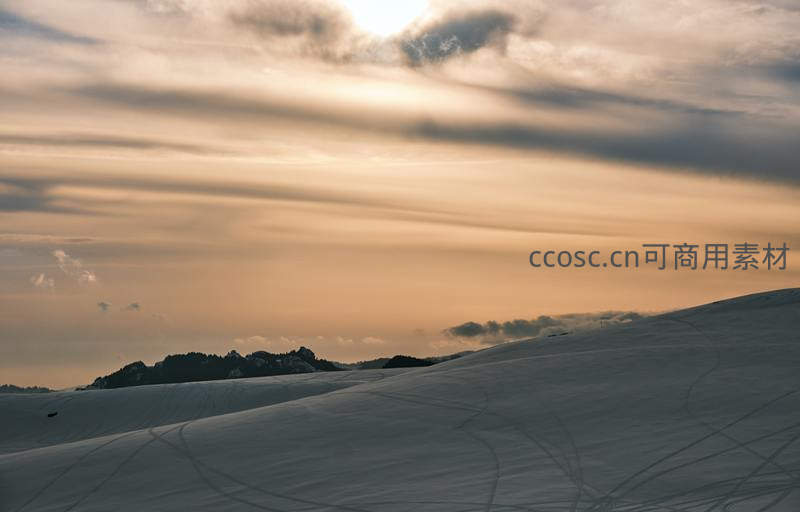 夕阳余晖洒在白雪覆盖的沙丘上,远山剪影朦胧,天空云层变幻,营造出静谧而壮阔的冬日奇景。