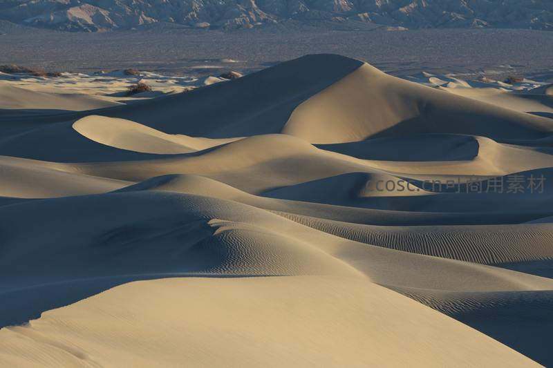 晨昏时分,阳光斜照在沙丘上,明暗对比强烈,勾勒出流畅优美的曲线,远处山脉更添雄浑气势。