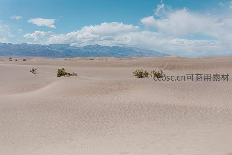 广袤沙海中零星散布着顽强的绿色灌木,远方是连绵的山脉和飘动的白云,展现生命在荒芜中的坚韧。