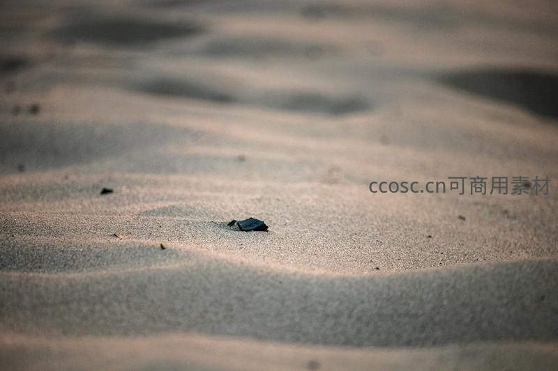 细密的沙粒在柔和光线下形成波纹,一枚深色碎石静卧其中,诉说着荒漠的孤寂与时间的痕迹。