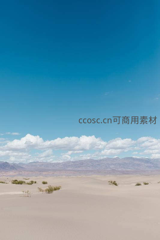 无垠的沙丘延伸至远方,点缀着稀疏的绿植,背景是连绵山脉和澄澈蓝天,营造出辽阔而宁静的旷野氛围。