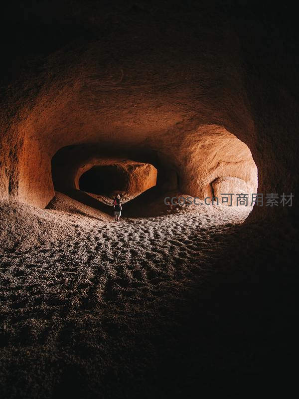 在巨大而幽暗的岩石洞穴中,一束光线照亮了中心区域,一个渺小的人影站立其间,凸显自然的宏伟与人的渺小。
