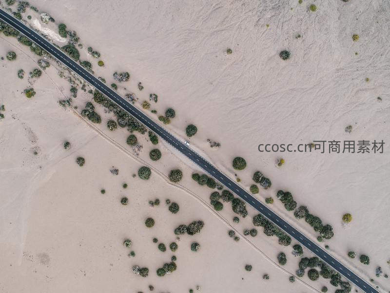 从高空俯瞰,一条笔直的黑色公路如丝带般穿过浅色沙漠,两旁散布着深绿色灌木丛,一辆小车正行驶其间。