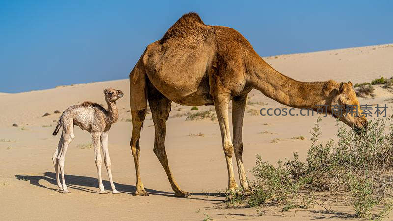 一只成年骆驼低头啃食沙丘上的灌木,身旁是它瘦弱的小骆驼,它们在广袤沙漠中相依为命,共同寻找食物。