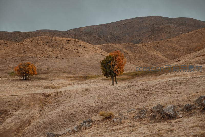 在一片干枯的棕色山坡上,两棵叶子泛黄的树木孤独伫立,天空阴沉,整个画面弥漫着深秋的寂寥与苍凉气息。