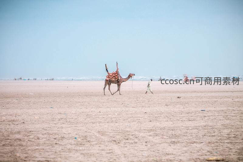 一人牵着装饰华丽的骆驼漫步在宽阔的沙滩上,远处是平静的海面和游客,充满异域风情与悠闲气息。