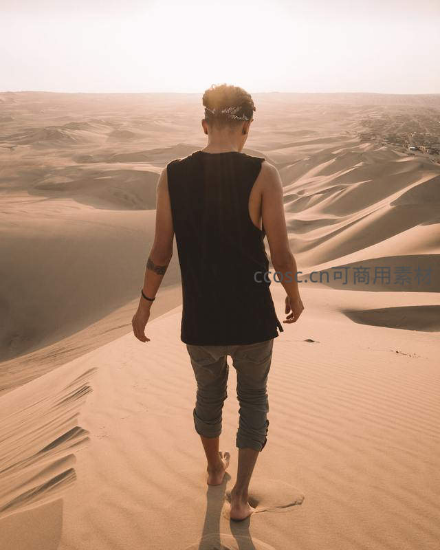 赤足行走在沙丘之巅的背影