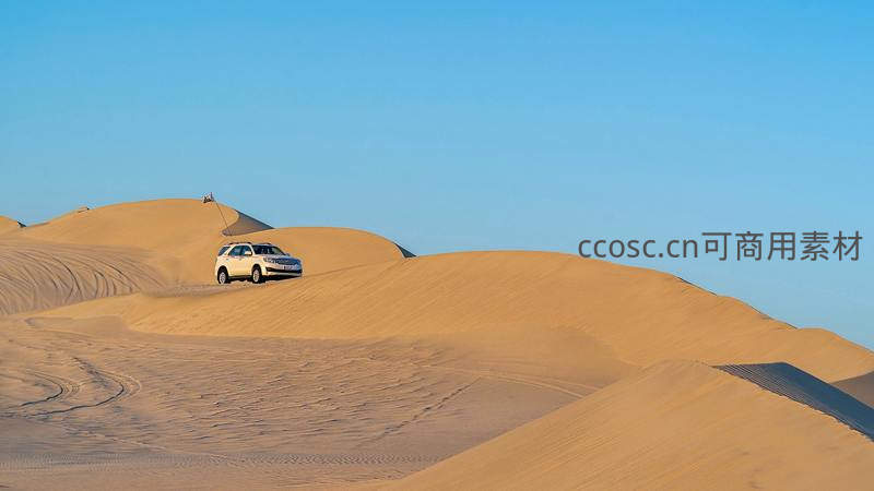 一辆白色越野车稳立于高耸沙丘之顶,车辙蜿蜒,蓝天为幕,彰显人与自然搏斗征服的豪迈与壮阔。