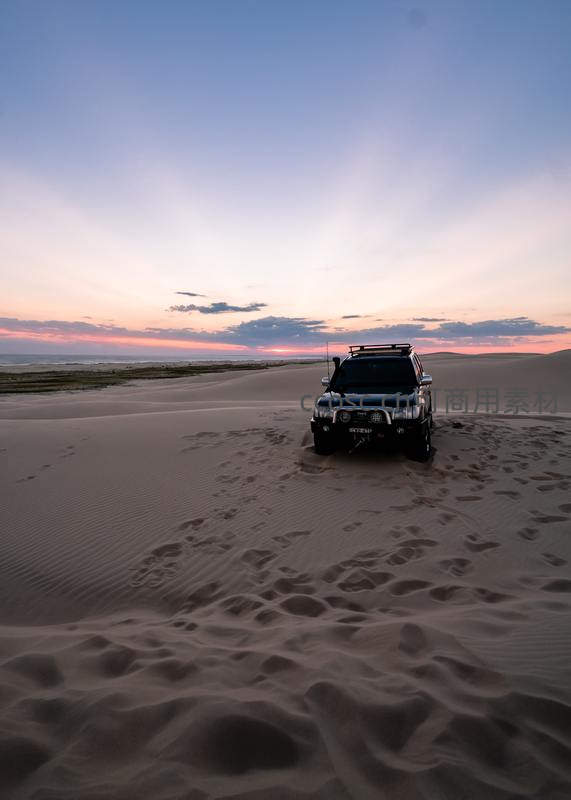 一辆黑色越野车停驻在广袤的沙丘之上,背景是绚烂的日落晚霞,天空与大地交融,营造出静谧而壮阔的氛围。