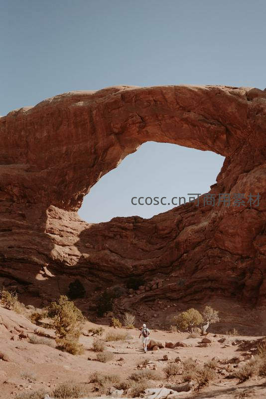 巨大的天然岩石拱门矗立于荒漠之中,一名旅人正从其下走过,宏伟地质结构与渺小人类形成强烈对比。