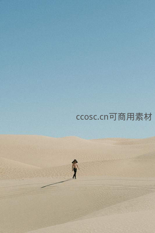 在一片纯净的蓝色天空下,一位戴着帽子的旅人独自走在广袤无垠的沙丘上,长长的影子投射在沙面上,尽显荒凉与自由之美。