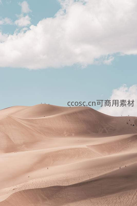 巨大的沙丘在蓝天白云下延绵不绝,山顶上散布着如蚂蚁般渺小的游客,突显了自然的宏伟壮丽与人类的微不足道。