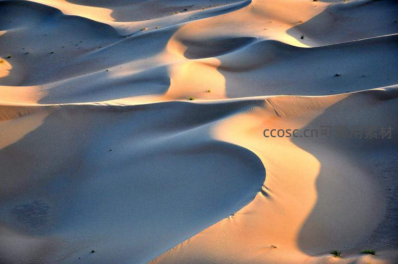 夕阳的余晖将沙丘染成温暖的金色,而背光处则呈现出冷峻的蓝色调,冷暖交融的光影勾勒出沙丘柔美的曲线,宛如一幅梦幻画卷。