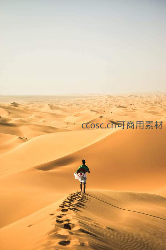 一人手持国旗伫立沙丘最高点,脚下足迹清晰,眼前是连绵起伏的金色沙海,象征征服与归属感。