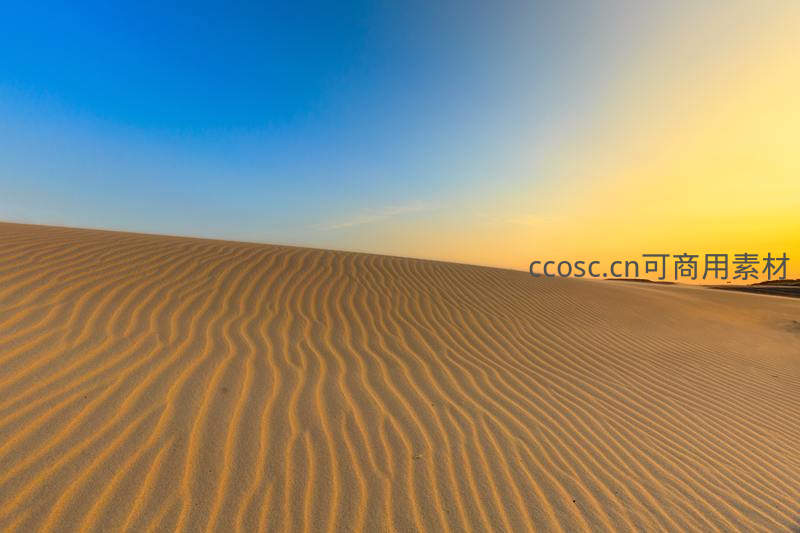 夕阳西下,金色的沙丘被染上温暖色调,细腻的沙纹如波浪般延展至天际,构成一幅宁静而壮丽的自然画卷。