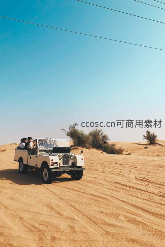 一辆白色经典越野车载着游客,在无垠的沙丘上飞驰,留下蜿蜒轨迹,蓝天为幕,尽显沙漠探险的自由与激情。