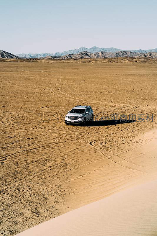 一辆银色SUV静立于广袤沙海中央,身后是清晰的车辙印,远处层叠山峦在晴空下勾勒出苍茫轮廓,展现人与自然的对话。